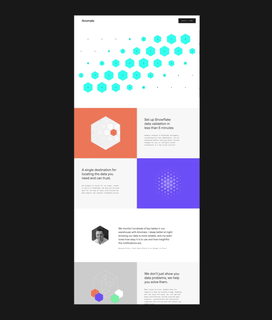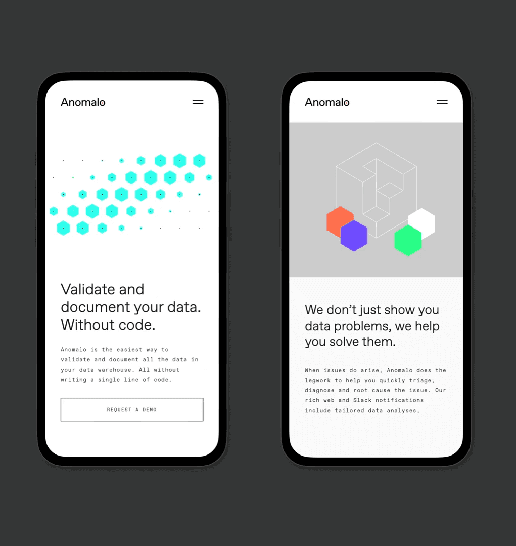 Naming, strategy, identity and web design for Anomalo, a data quality platform who received $33M in Series A funding following our work.