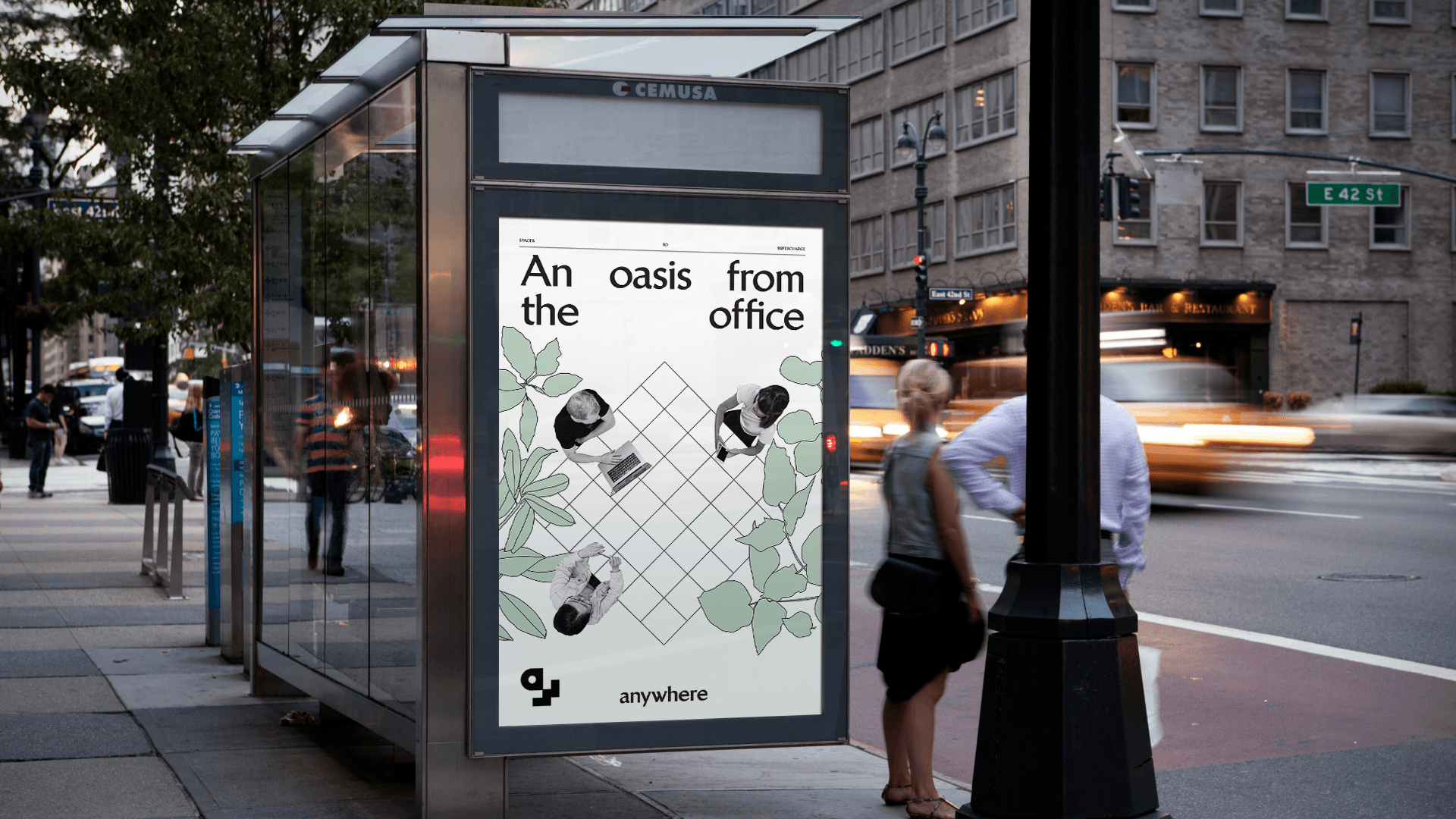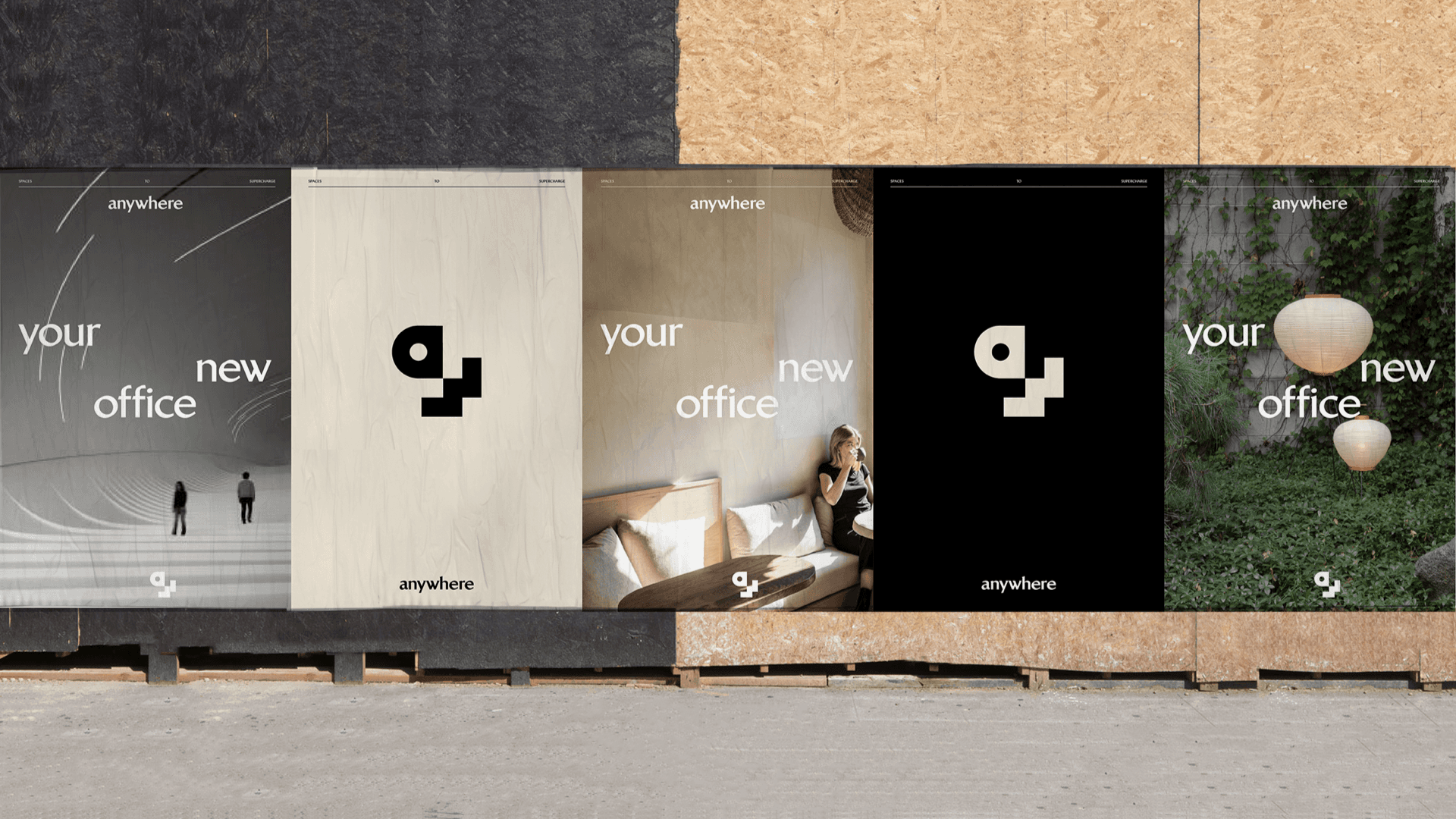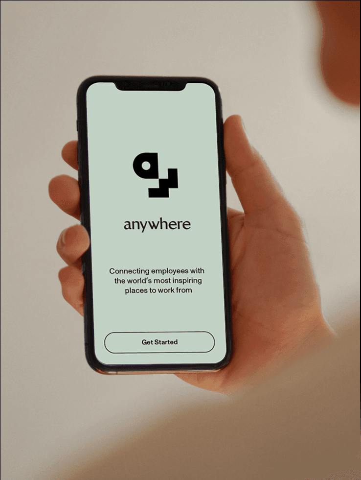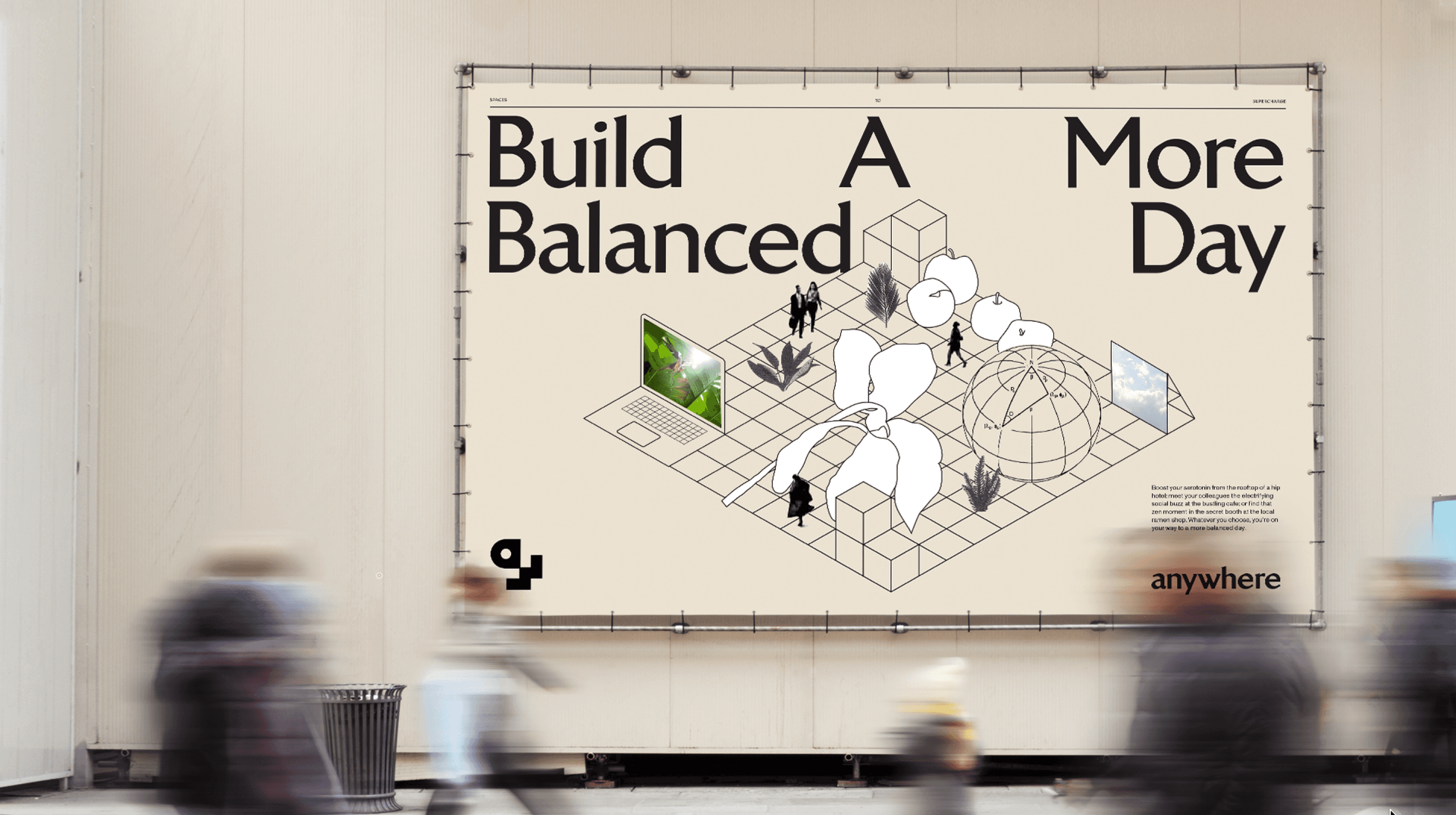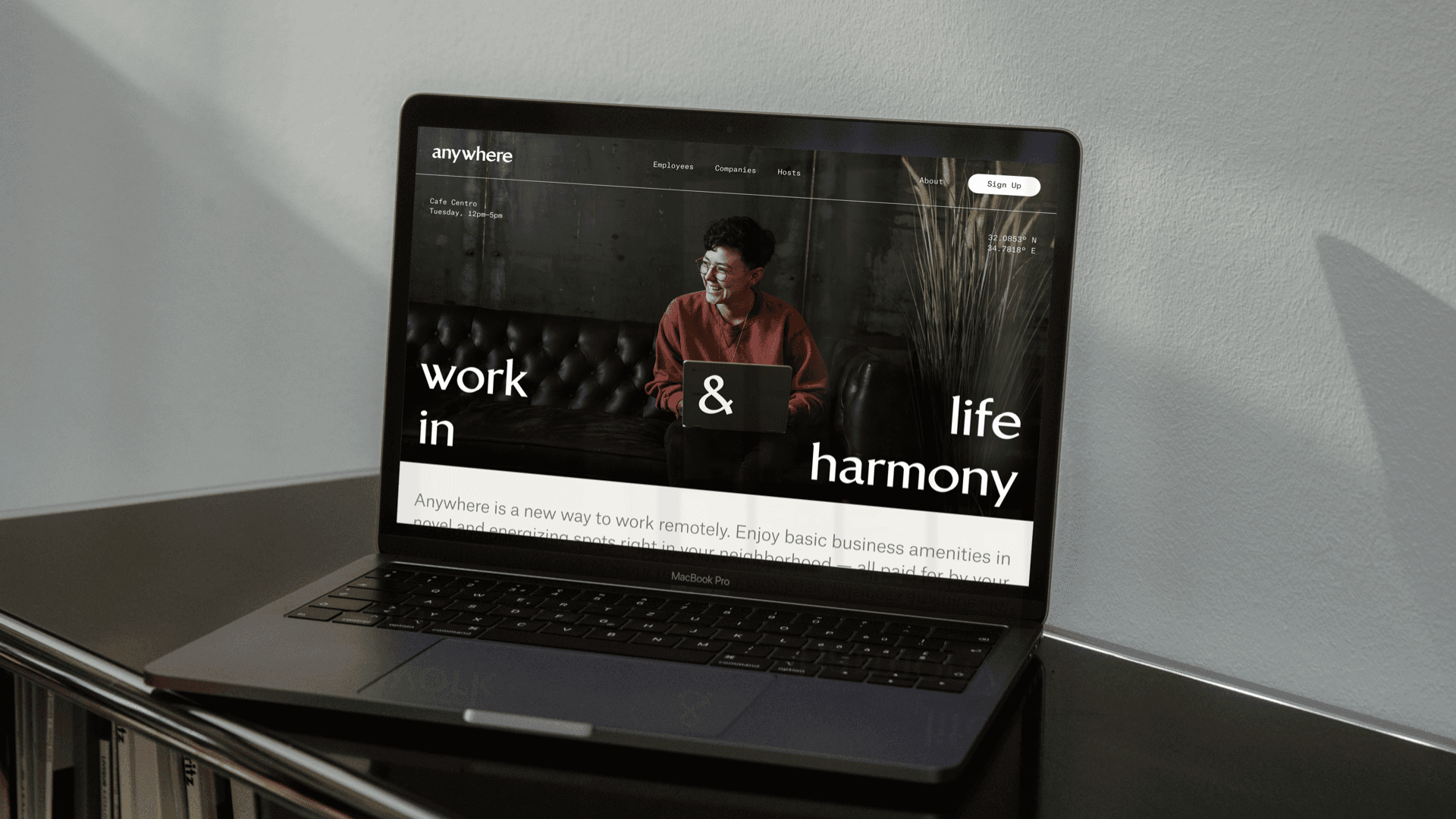 Bridging the hospitality industry and corporate HR, Anywhere offers employees the option to work from connected spaces in cities as a third space away from the office and home. The benefits to well being were hinted through wellness notes in the typography and palette, while the added focus and underlying rigor of the platform were visualized in a more technical voice.