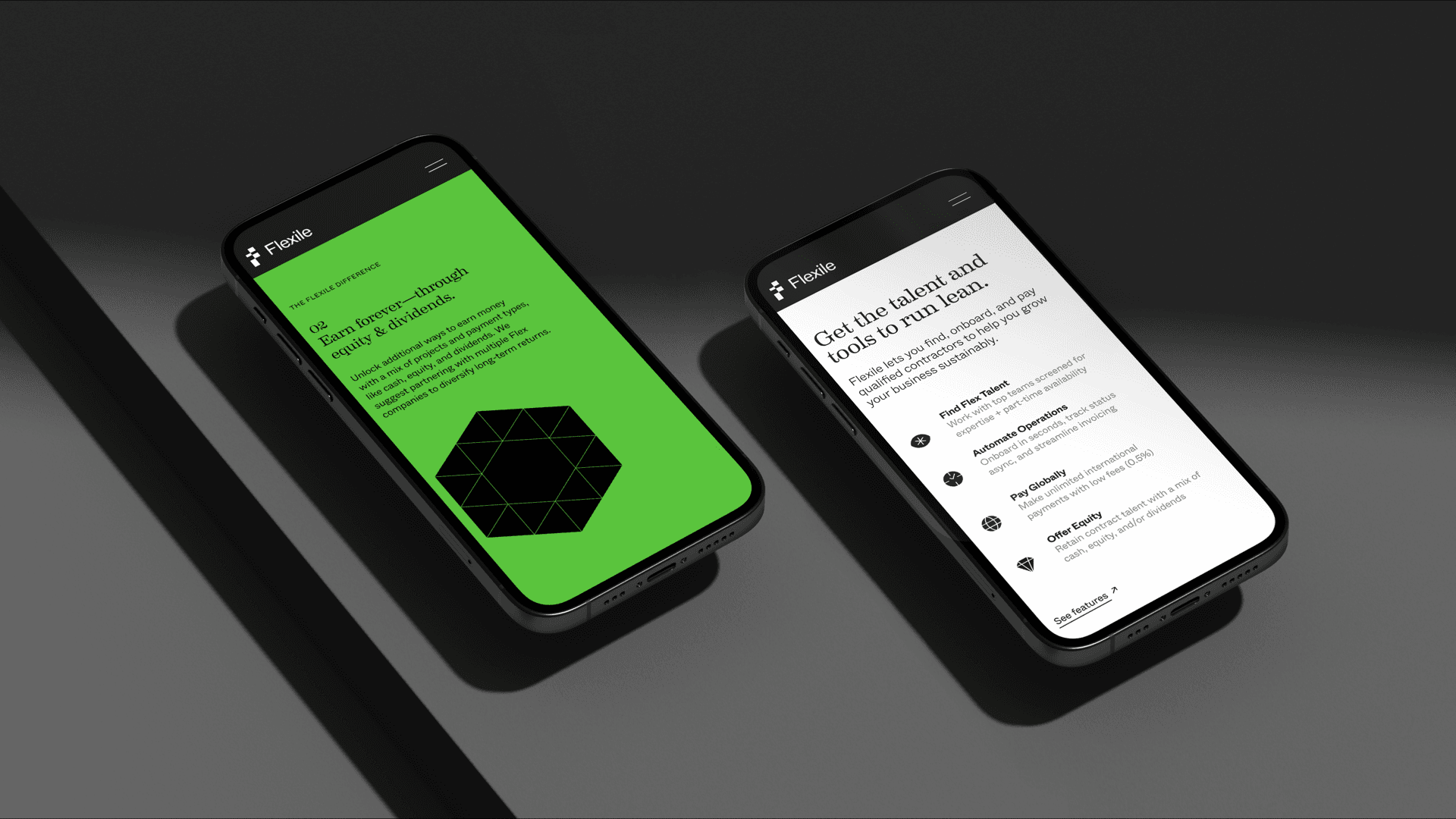 Flexile is an operating system for entrepreneurs managing distributed teams with options for fractional payment. Our identity system played wit the concept of the minimalist business, startups who can stay lean powered by Flexile's operations platform.